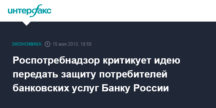 Москва. 15 мая. INTERFAX.RU - Роспотребнадзор негативно относится к идее "расширить компетенцию единого регулятора на финансовом рынке вопросами защиты прав и интересов физических лиц - не только потребителей страховых, инвестиционных и иных финансовых услуг, но и потребителей банковских услуг", содержащейся в законопроекте о мегарегуляторе.