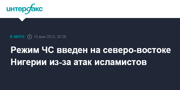 Йоханнесбург. 15 мая. INTERFAX.RU - Власти Нигерии ввели режим ЧС на северо-востоке страны в связи с повышенной активностью исламистов, сообщил в среду президент страны Гудлак Джонатан.