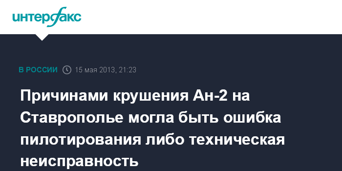 Ставрополь. 15 мая. INTERFAX.RU - В ходе доследственной проверки по факту крашения самолета Ан-2 на Ставрополье выдвинуты две версии причины аварии, сообщил агентству "Интерфакс" руководитель Минераловодского следственного отдела на транспорте Южного СУТ СК РФ Алексей Мисаев.
