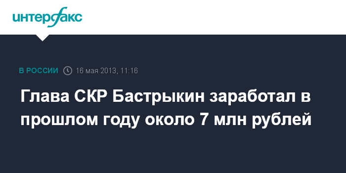 Москва. 16 мая. INTERFAX.RU - Председатель Следственного комитета России Александр Бастрыкин в прошлом году заработал порядка 7 млн рублей. Официальный представитель ведомства Владимир Маркин - около 2 млн.
