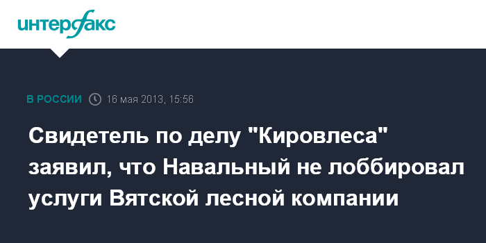 Москва. 16 мая. INTERFAX.RU - Свидетель по уголовному делу в отношении оппозиционера Алексея Навального заявил в суде, что никогда не слышал, чтобы подсудимый агитировал "Кировлес" и подшефные ему лесхозы работать с Вятской лесной компанией.