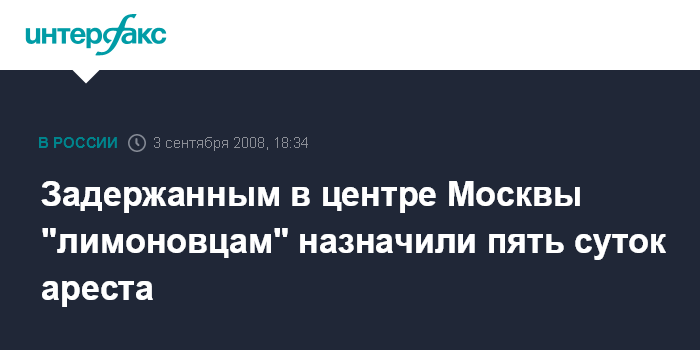 Москва. 3 сентября. INTERFAX.RU - Пресненский суд Москвы назначил двоим "лимоновцам" по пять суток административного ареста за акцию протеста у Белого дома, сообщают в коалиции "Другая Россия".