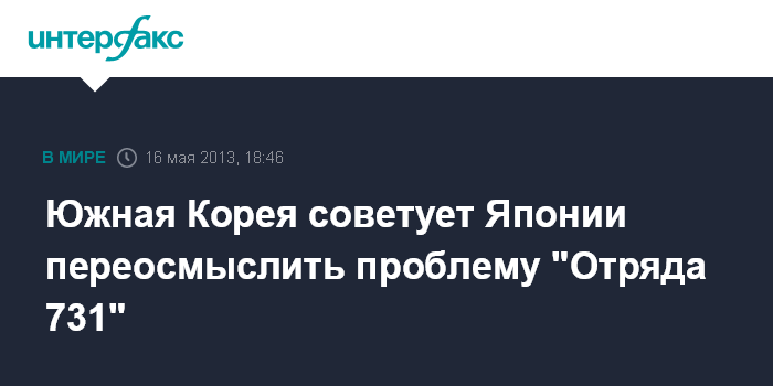Сеул. 16 мая. INTERFAX.RU - Южная Корея призывает Японию задуматься об одном из эпизодов ее истории, связанным с деятельностью так называемого "Отряда 731", испытывавшего биологическое оружие на людях, заявил в четверг представитель министерства иностранных дел Южной Кореи.