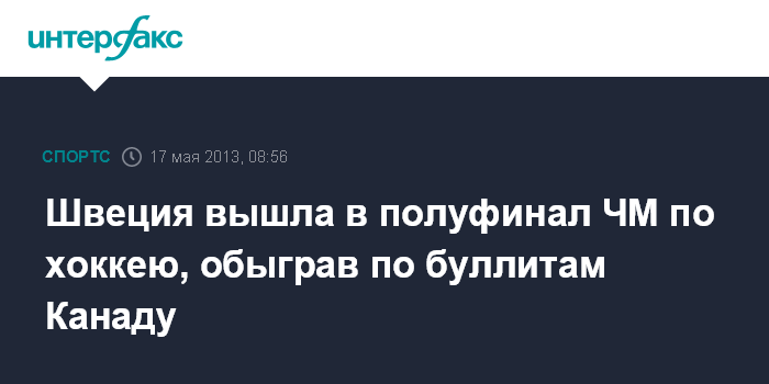 Москва. 17 мая. INTERFAX.RU - Сборная Швеции по хоккею завоевала путевку в 1/2 финала чемпионата мира 2013 года.
