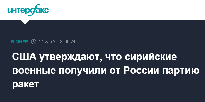 Вашингтон. 17 мая. INTERFAX.RU - Россия отправила в Сирию партию противокорабельных ракет "Яхонт", пишет газета The New York Times со ссылкой на неназванных американских чиновников.