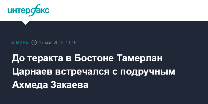 Вашингтон. 17 мая. INTERFAX.RU - Главный подозреваемый в организации и совершении терактов во время бостонского марафона Тамерлан Царнаев встречался с чеченским сепаратистом в Манчестере, штат Нью-Гемпшир, за несколько недель до взрывов, в результате которых погибли трое и были ранены более 260 человек.