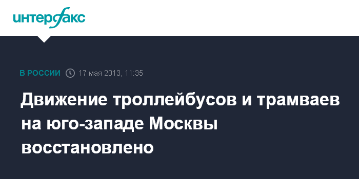 Москва. 17 мая. INTERFAX.RU - Движение троллейбусов, следующих по маршруту номер 72, и трамваев номер 14 и 39 на юго-западе Москвы восстановлено после ликвидации последствий ДТП, сообщает пресс-центр департамента транспорта и развития дорожно-транспортной инфраструктуры в четверг.