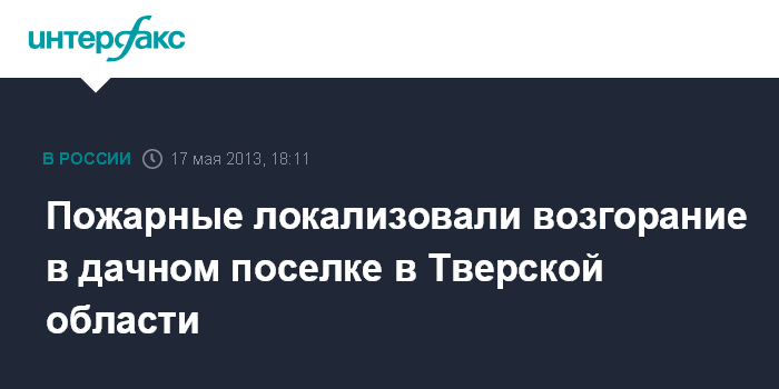 Москва.17 мая. INTERFAX.RU - Пожар в дачном поселке Великий двор в Тверской области локализован, сообщили "Интерфаксу" в МЧС России. "Пожар локализован в 17:47 мск. Сгорел один жилой дом, пострадавших нет", - отметили в МЧС. В настоящее время проводится дотушивание тлеющих построек, работает вертолет.