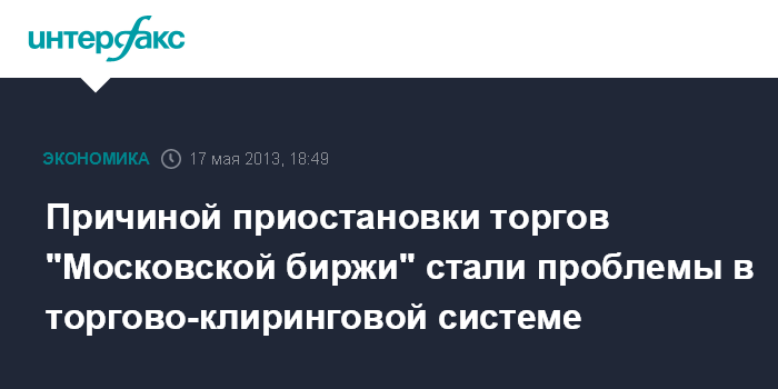 Москва. 17 мая. INTERFAX.RU - Причиной приостановки торгов в секторе основного рынка "Московской биржи" в пятницу стали затруднения в работе торгово-клиринговой системы, говорится в сообщении биржи. "В результате ошибки, произошедшей при выполнении плановых процедур, возникли затруднения в работе торгово-клиринговой системы сектора "основной рынок", - говорится в сообщении.