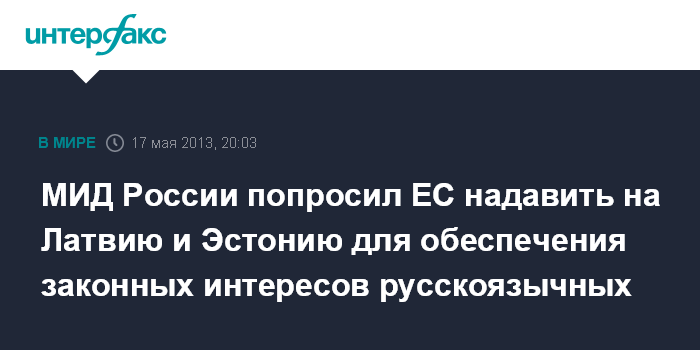 Москва. 17 мая. INTERFAX.RU - Москва призывает Брюссель оказать эффективное давление на правительства Латвии и Эстонии для обеспечения прав русскоязычного населения этих стран, а также воздержаться от идеологизированных оценок в связи с законодательством РФ о некоммерческих организациях.