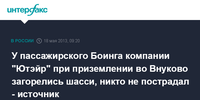 У пассажирского Боинга компании "Ютэйр" при приземлении во Внуково загорелись шасси, никто не пострадал - источник