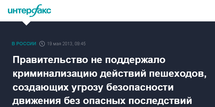 Москва. 19 мая. ИНТЕРФАКС - Правительство считает нуждающимся в дополнительном обосновании законопроект, предлагающий установление уголовной ответственности отдельных участников движения за нарушение правил безопасности движения или эксплуатации транспортных средств, создавшее угрозу жизни и здоровью окружающих без общественно опасных последствий.