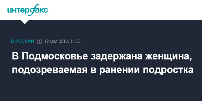 Москва. 19 мая. INTERFAX.RU - Подмосковные полицейские задержали в воскресенье женщину, которая подозревается в нанесении тяжелого ранения 15-летнему подростку, сообщает сайт ГУ МВД по Московской области.