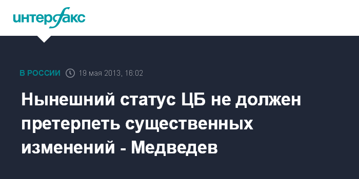 Сочи. 19 мая. INTERFAX.RU - Нынешний статус Центрального банка не должен претерпеть существенных изменений, считает премьер-министр РФ Дмитрий Медведев.