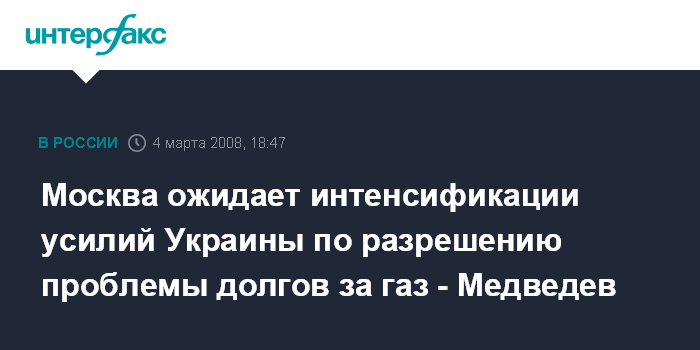 Д.Медведев также отметил, что российская сторона "ожидает интенсификации усилий Киева по скорейшему разрешению проблемы долгов за поставленный газ", говорится в сообщении.