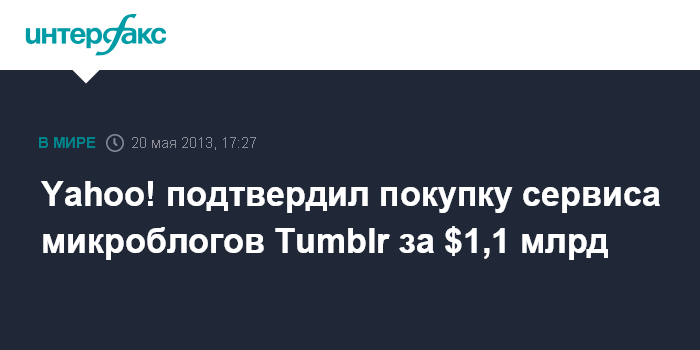 Нью-Йорк. 20 мая. INTERFAX.RU - Yahoo Inc. покупает сервис микроблогов Tumblr за $1,1 млрд, сообщается в пресс-релизе крупнейшего поисковика в США.