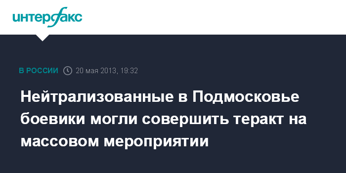Москва. 20 мая. INTERFAX.RU - Нейтрализованные в понедельник в Орехово-Зуево боевики готовили теракт на одном из массовых мероприятий в Москве, сообщил "Интерфаксу" источник в правоохранительных органах.