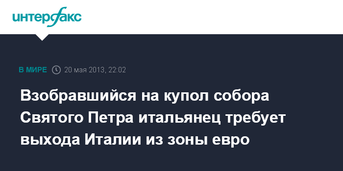 Взобравшийся на купол собора Святого Петра итальянец требует выхода Италии из зоны евро