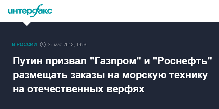 Сочи. 21 мая. INTERFAX.RU - Национальные добывающие компании должны размещать заказы на производство морской техники на российских верфях, если это возможно, заявил Владимир Путин.