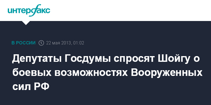 Москва. 22 мая. ИНТЕРФАКС-АВН - Депутаты Госдумы в ходе "правительственного часа", который состоится в среду, хотели бы услышать от министра обороны Сергея Шойгу характеристику боевых возможностей Вооруженных сил РФ и показатели выполнения госпрограммы вооружений, сообщил журналистам председатель комитета Госдумы по обороне Владимир Комоедов.