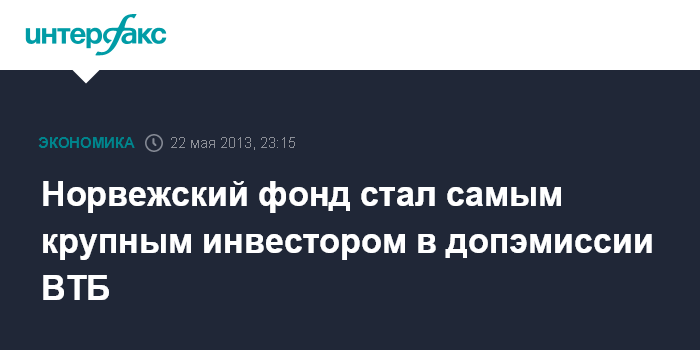 Москва. 22 мая. INTERFAX.RU - Норвежский суверенный фонд стал самым крупным инвестором в ходе размещения допэмиссии ВТБ, сообщил агентству "Интерфакс" источник на финансовом рынке.