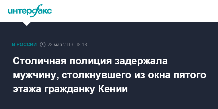 Москва. 23 мая. INTERFAX.RU - Столичная полиция задержала мужчину, подозреваемого в том, что он столкнул гражданку Кении с пятого этажа, сообщили "Интерфаксу" в пресс-службе ГУ МВД РФ по Москве в четверг. Там напомнили, что в минувшую субботу на Волочаевской улице, дом 18, в юго-восточном округе Москвы произошло падение с пятого этажа 19-летней приезжей из Кении.