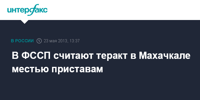 Москва. 23 мая. INTERFAX.RU - Теракт в Махачкале, совершенный 20 мая этого года, мог стать местью судебным приставам Дагестана за их принципиальную позицию при исполнении судебных решений. Об этом в четверг "Интерфаксу" заявило руководство Федеральной службы судебных приставов (ФССП).