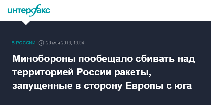 Москва. 23 мая. INTERFAX.RU - В случае пуска с южного направления ракет в сторону Европы, они будут сбиты над территорией России, заявил заместитель министра обороны Анатолий Антонов.