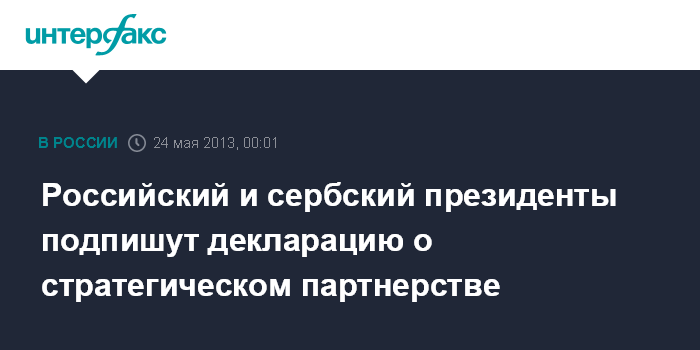Москва. 24 мая. INTERFAX.RU - Декларация о стратегическом партнерстве между Россией и Сербией будет подписана в пятницу в Сочи в ходе переговоров президентов двух стран Владимира Путина и Томислава Николича.