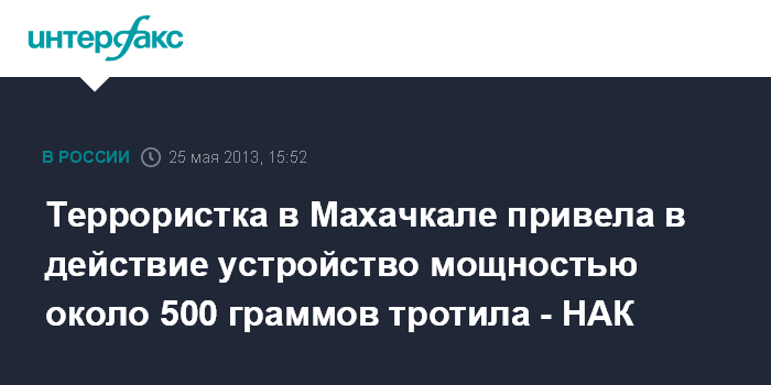 Москва. 25 мая. INTERFAX.RU - Установлен тип взрывного устройства, использованного террористкой-смертницей при самоподрыве в Махачкале, сообщили "Интерфаксу" в информцентре Национального антитеррористического комитета (НАК).