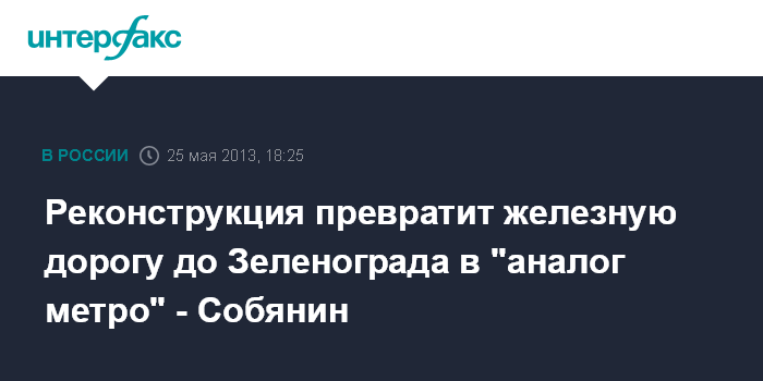 Москва. 25 мая. INTERFAX.RU - Реконструкция участка железной дороги от Москвы до платформы Крюково в Зеленограде должна быть завершена в будущем году, сообщил в субботу на встрече депутатов муниципального образования Зеленограда мэр Москвы Сергей Собянин.