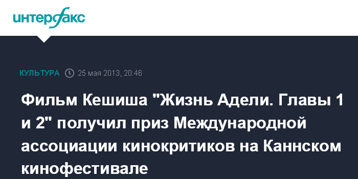 Канны. 25 мая. INTERFAX.RU - Приз Международной ассоциации кинокритиков (ФИПРЕССИ) 66-го Каннского фестиваля был вручен в субботу фильму Абдельлатифа Кешиша "Жизнь Адели. Главы 1 и 2" (международное название фильма - "Голубой - самый теплый цвет" из основной конкурсной программы, передает корреспондент "Интерфакса".