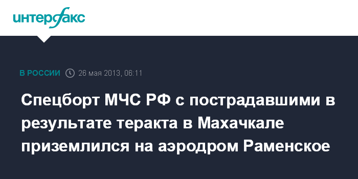 Раменское (Московская область). 26 мая. ИНТЕРФАКС - Самолет МЧС РФ доставил из Дагестана в Москву троих пострадавших в результате теракта в субботу в Махачкале.