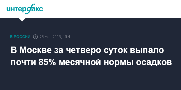 Москва. 26 мая. INTERFAX.RU - В российской столице со среды по субботу выпало 43 мм осадков при месячной норме 51 мм, сообщили "Интерфаксу" в Гидрометеобюро Москвы и области в воскресенье. "Это 84% от климатической нормы для мая", - рассказал собеседник агентства.