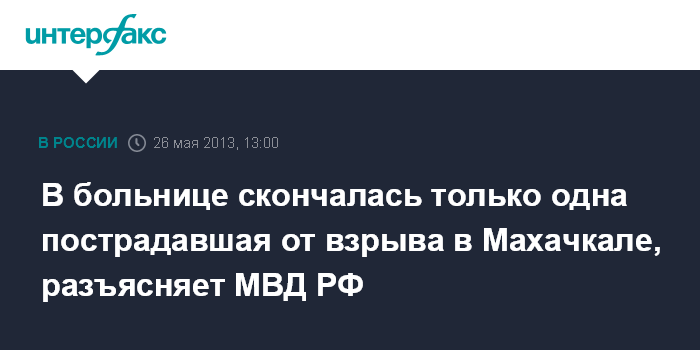 Москва. 26 мая. INTERFAX.RU - МВД РФ вновь уточняет информацию о погибших в результате взрыва у здания МВД Дагестана в Махачкале: среди мирного населения есть только одна жертва.