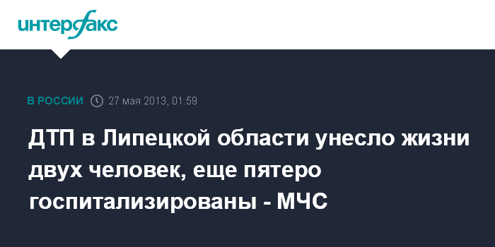 Москва. 27 мая. ИНТЕРФАКС - Два человека погибли и пятеро пострадали в ДТП с участием легкового автомобиля в Липецкой области, сообщили "Интерфаксу" в МЧС России.