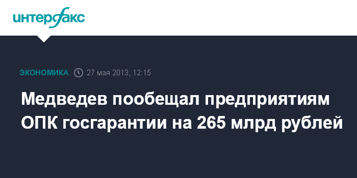 Горки. 27 мая. INTERFAX.RU - Премьер-министр РФ Дмитрий Медведев сообщил, что подписал распоряжение о предоставлении в 2013 году 40 госгарантий на 265 млрд рублей по кредитам, привлекаемым оборонными предприятиями.