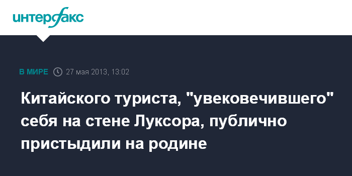 Москва. 27 мая. INTERFAX.RU - Молодой китайский турист, который нацарапал свое имя на стене Луксорского храма в Фивах (Египет), вызвал гнев в Китае, сообщает China.org.