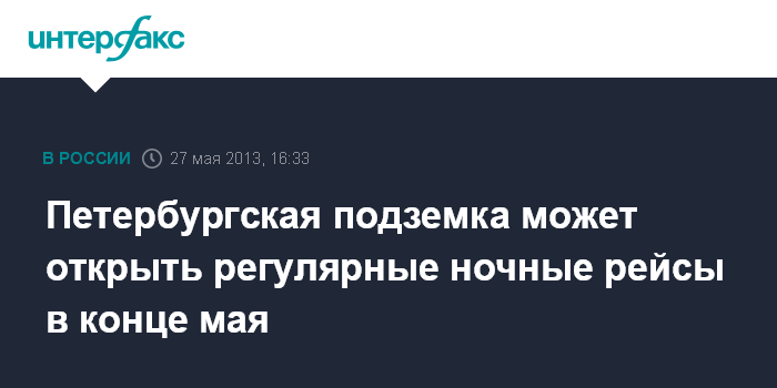 Санкт-Петербург. 27 мая. INTERFAX.RU - Городской комитет по транспорту и петербургский метрополитен ведут подготовку к запуску ночного поезда-челнока в ежедневном режиме, который запланирован на 31 мая, сообщает пресс-служба профильного комитета Смольного.