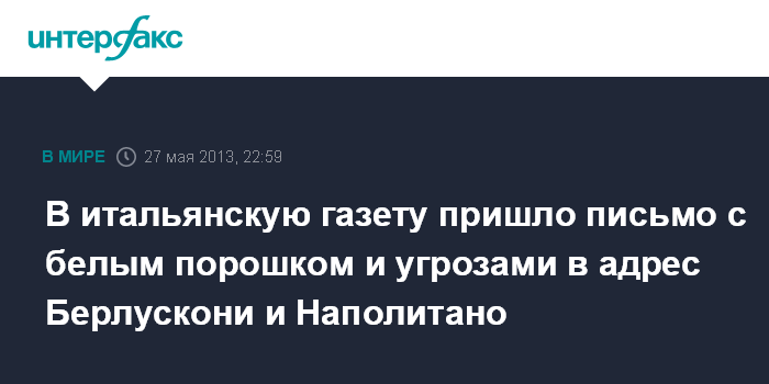 Рим. 27 мая. INTERFAX.RU - Редакция итальянской газеты Corriere della Sera в понедельник получила письмо, содержащее подозрительный белый порошок и письмо с угрозами в адрес итальянского президента Джорджо Наполитано и бывшего премьера Сильвио Берлускони, сообщается на сайте издания.
