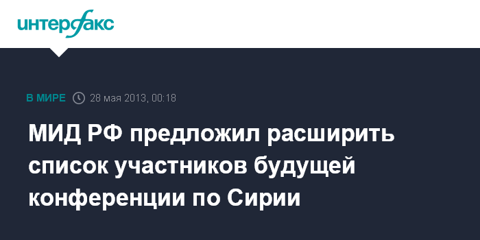 Париж. 28 мая. INTERFAX.RU - Российская сторона считает необходимым расширить список участников будущей международной конференции по Сирии, заявил глава МИД РФ Сергей Лавров по итогам прошедшей в понедельник в Париже встречи с госсекретарем США Джоном Керри.