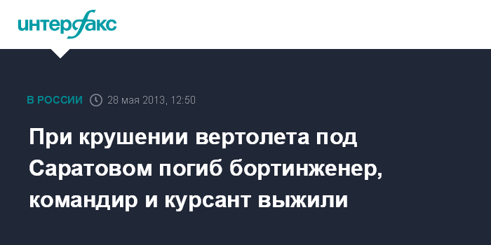 Москва. 28 мая. INTERFAX.RU - В катастрофе вертолета Военно-воздушных сил Ми-8 в Саратовской области из трех членов экипажа удалось выжить командиру и курсанту, бортинженер погиб, информирует Минобороны России.