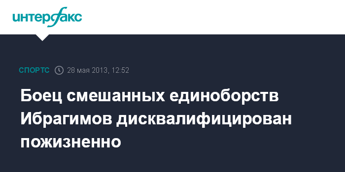 Москва. 28 мая. INTERFAX.RU - Организация по проведению турниров по смешанным единоборствам M-1 Global приняла решение о пожизненной дисквалификации Ибрагима Ибрагимова за неспортивное поведение после боя с Денисом Смолдаревым на турнире M-1 Challenge 39.
