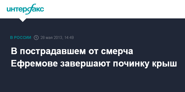 Тула. 28 мая. INTERFAX.RU - В городе Ефремов Тульской области, серьезно пострадавшем на прошлой неделе от смерча, продолжаются ремонтные работы, восстановлено уже почти 90% кровли в жилых домах и соцобъектах, сообщили "Интерфаксу" во вторник в пресс-службе областного управления МЧС.