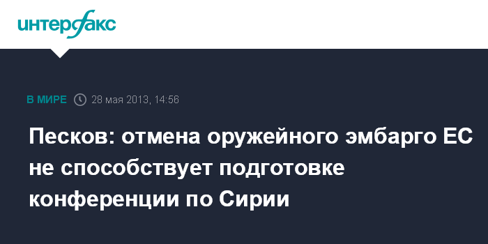 Бишкек. 28 мая. INTERFAX.RU - Решение ЕС отменить эмбарго на поставки оружия сирийской оппозиции не способствует подготовке международной конференции по Сирии, заявил пресс-секретарь президента России Дмитрий Песков.