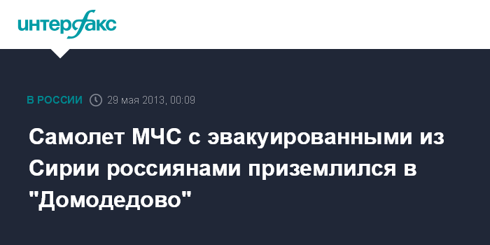 Москва. 29 мая. INTERFAX.RU - В столичном аэропорту "Домодедово" приземлился самолет МЧС РФ, на борту которого россияне и граждане СНГ пожелавшие покинуть Сирию, сообщили "Интерфаксу" в управлении информации ведомства. "Самолет "ИЛ-62" приземлился в "Домодедово" несколько минут назад. Он доставил в столицу из Сирии 128 россиян и граждан СНГ, пожелавших покинуть опасный регион", - отметили в МЧС.