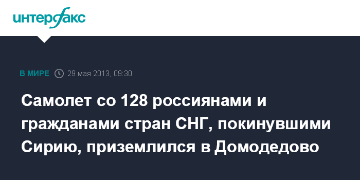 Москва. 29 мая. INTERFAX.RU - В столичном аэропорту "Домодедово" приземлился самолет МЧС РФ, на борту которого россияне и граждане СНГ пожелавшие покинуть Сирию, сообщили в среду "Интерфаксу" в управлении информации ведомства.