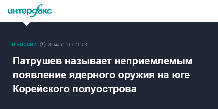 "Также не приемлем перспективу "второго пришествия" ядерного оружия на юг Корейского полуострова, будь то возвращение иностранных тактических ракет или разработка Южной Кореей собственных", - заявил Патрушев.