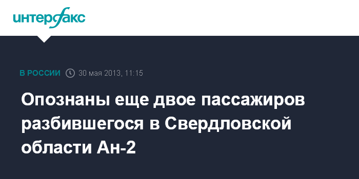 Екатеринбург. 30 мая. INTERFAX.RU - Эксперты идентифицировали личности еще двух пассажиров самолета Ан-2, обломки которого были найдены под Серовом в Свердловской области.