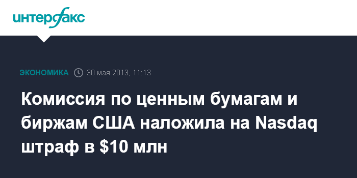30 мая. FINMARKET.RU - Комиссия по ценным бумагам и биржам (SEC) США наложила на Nasdaq OMX Group Inc. рекордный штраф в размере $10 млн. Как пишет The Wall Street Journal, штраф наложен из-за проблем вокруг листинга Facebook в мае прошлого года.